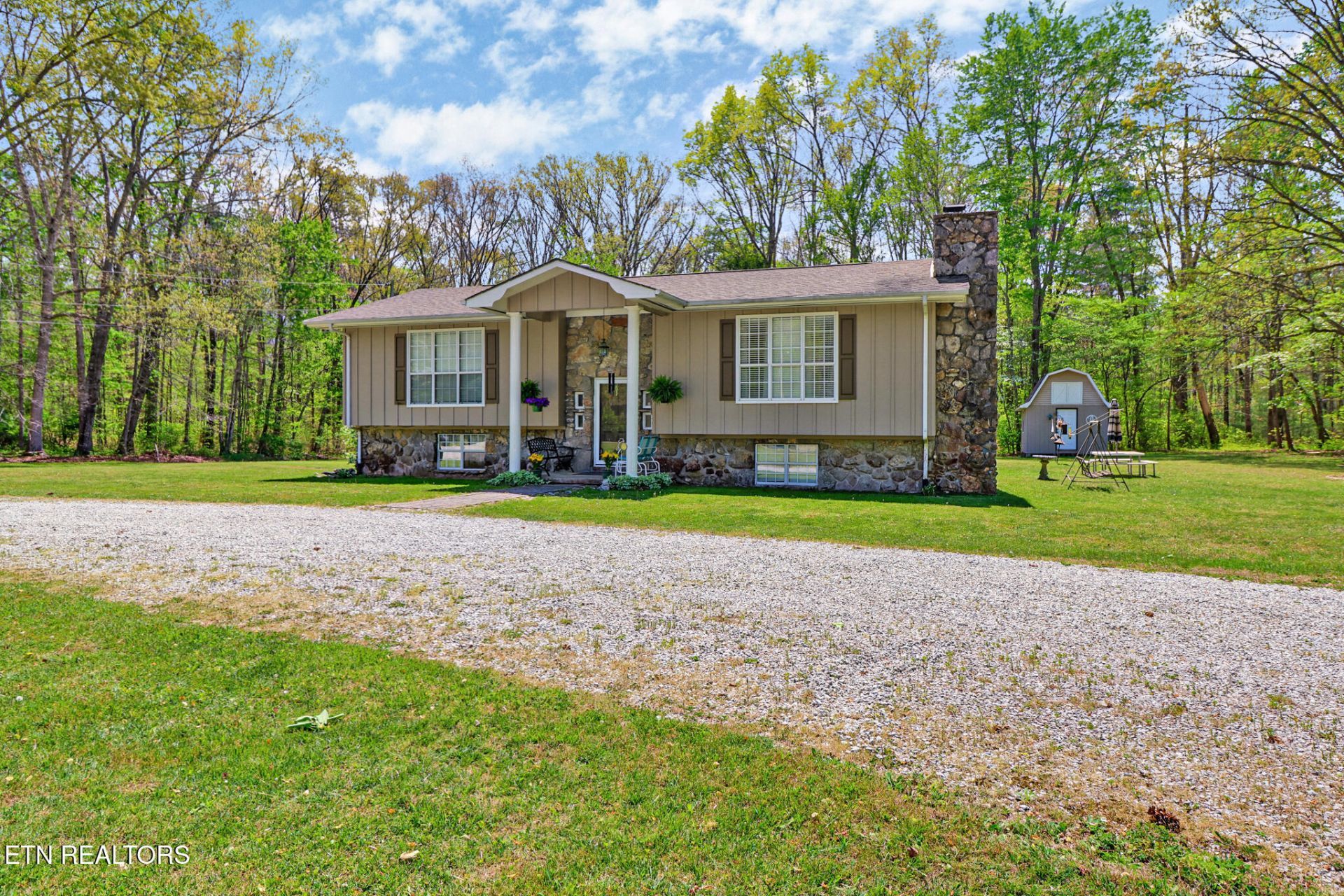 Beautiful stone and wood exterior give this split-level home standout curb appeal. Step inside to gleaming 3/4 hardwood floors, a cozy wood-burning stone fireplace, and striking exposed wood beams that add warmth and character throughout. The kitchen features custom-built cabinetry with everything conveniently within reach, and all appliances convey with the home. The spacious primary bedroom includes a walk-in closet for ample storage. Additional living space includes another bedroom, a comfortable family room, a large laundry area, and an extra room perfect for storage or flexible use. Outside, enjoy a beautiful, level yard shaded by mature trees, along with a storage building for added convenience.Schedule your showing today!